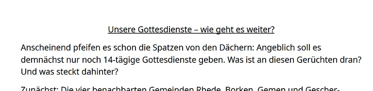 Die regelmäßigen Gottesdienste finden jeden 1. und 3. Sonntag im Monat um 9:30 Uhr in der Martin-Luther-Kirche statt. Am 2. und 4. Sonntag ist die Kirche zum Beten geöffnet, aber zur Zeit (noch) ohne Gottesdienste. An diesen Sonntagen finden aber z.B. Gottesdienste in unseren Nachbargemeinden Rhede (11 Uhr) und verschiedenen Predigtstätten der Kirchengemeinde Gemen statt. Änderungen sind möglich. Beachten sie bitte den Kalender hier auf dieser Webseite. Wenn sich kurzfristig etwas ändert, finden sie es dort.